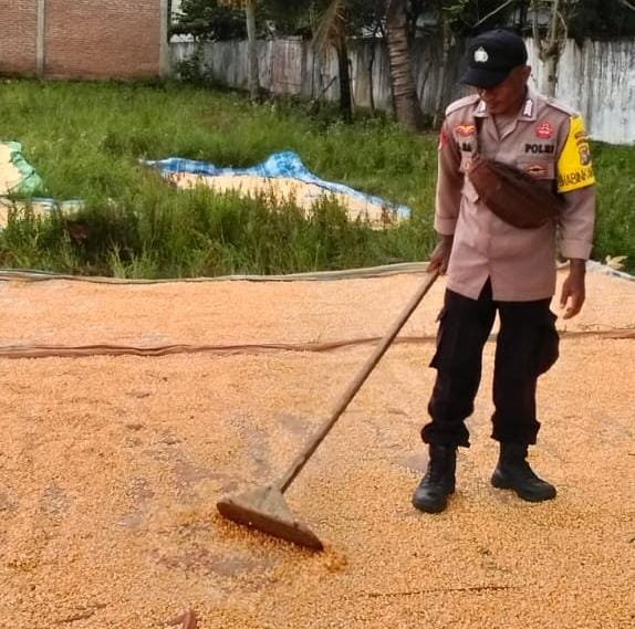 Sebagai bagian dari upaya mendukung penuh program ketahanan pangan nasional Bhabinkamtibmas Polsek Parado Polres Bima Polda NTB, membantu proses penjemuran jagung warga.